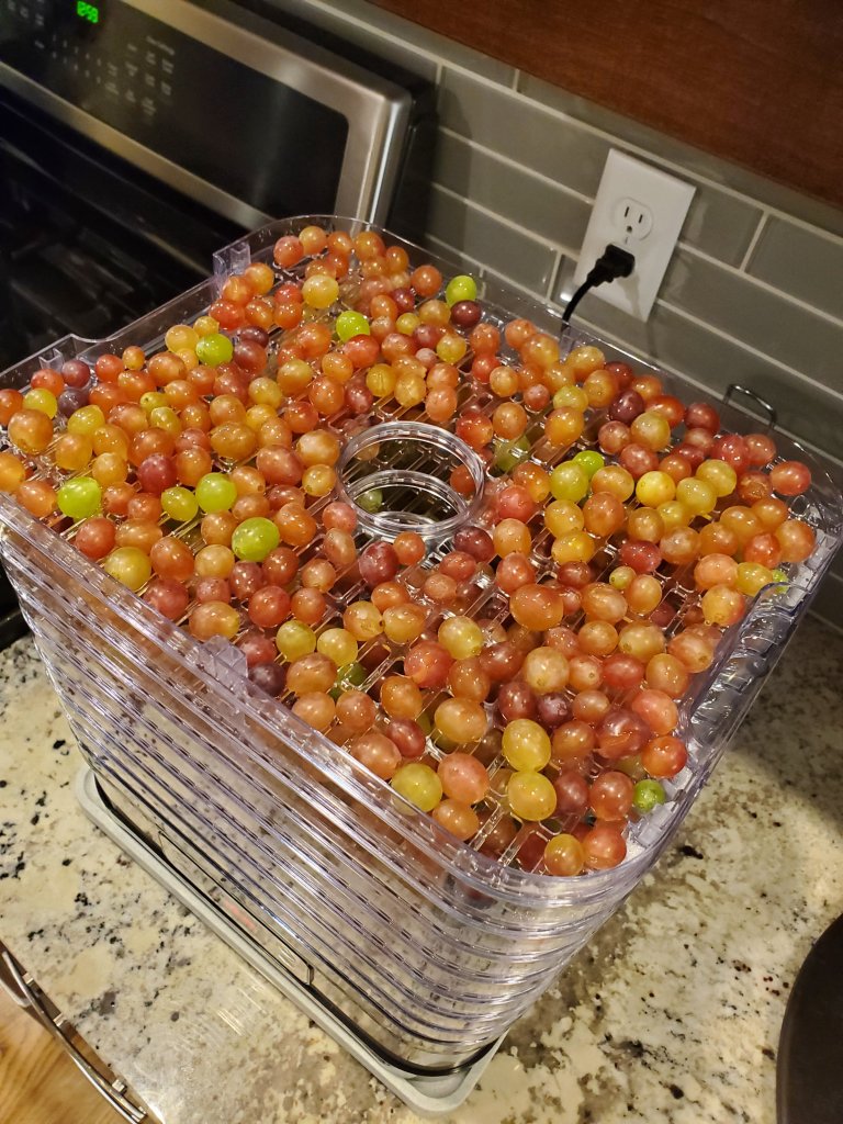 Grapes – This was our stellar crop this year! Because of the snow, we had to bring them all in at once and we got about 60 pounds! I don’t know the varieties but we know they aren’t wine grapes. We had a few bird problems during the summer but we were able to chase them off! So last weekend, we started our first batch of homemade wine… no guarantees here but a great way to use up a lot of grapes. We have been sending them home with friends and making raisins this week! Next is a grape blend fruit leather on the dehydrator (it needed a break!) and freezing up whatever juice we have left for smoothies and cocktails!